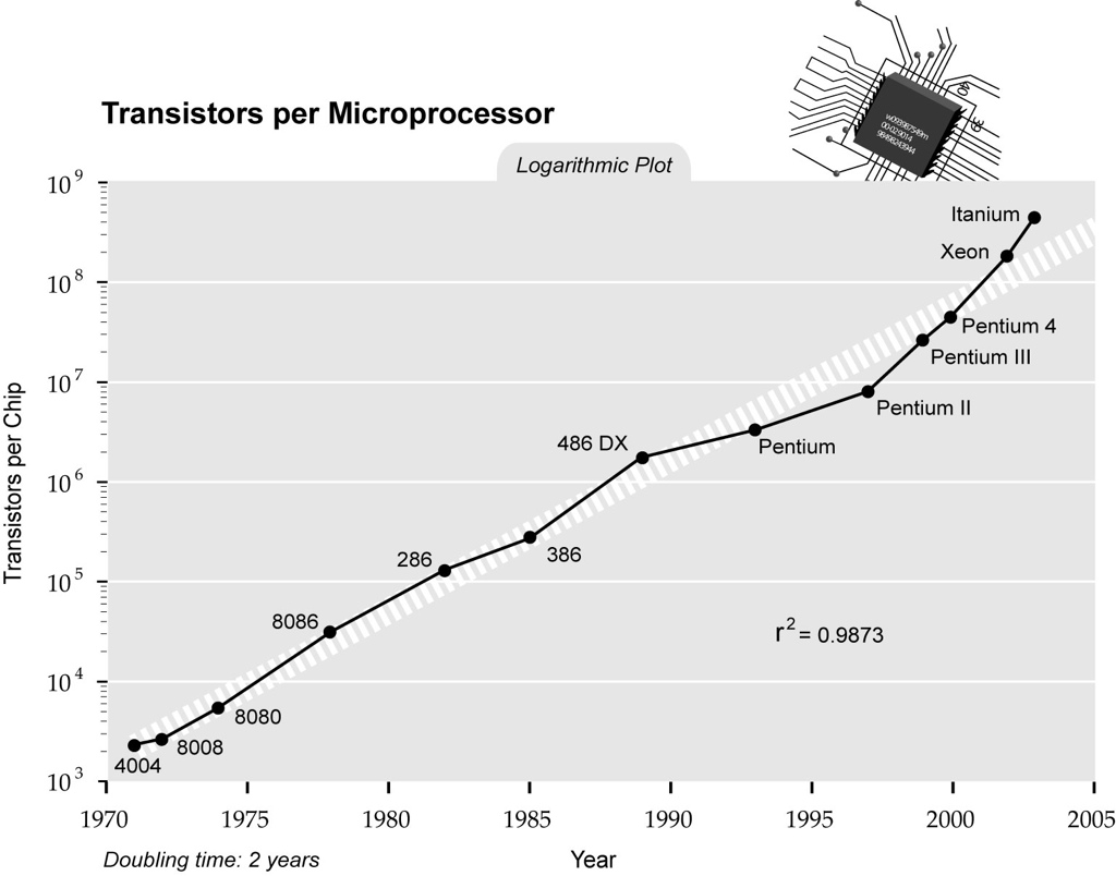 Moores Gesetz (Moore's law) wurde ursprünglich formuliert in „Cramming more components onto integrated circuits“, Electronics Magazine 19 April 1965 und lautet: