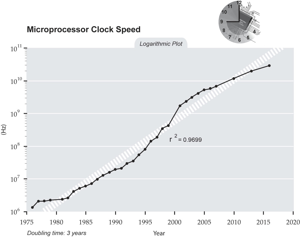 Diese Grafik zeigt eine Vorhersage von Ray Kurzweil aus dem Jahre 2005. Kurzweil hat damals noch geglaubt, dass die Taktraten weiterhin parallel mit der Anzahl der Transistoren steigen. Diese Vorhersage hat sich nicht bewahrheitet, wie wir heute wissen, da durch die Taktraten der Energieverbrauch der Prozessoren ebenfalls steigt und Bereiche erklommen hat, die als nicht mehr akzeptabel gelten. Insofern haben wir im Jahre 2010 nicht die 10 GHz-Prozessoren gesehen, die Kurzweil 2005 vorhergesagt hat.
