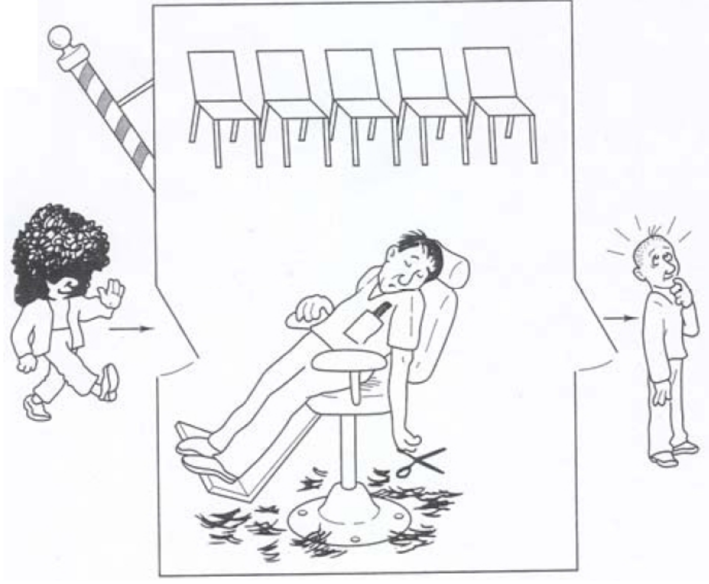 - Falls kein Kunde anwesend ist, setzt sich der Friseur auf seinen Friseurstuhl und schläft.